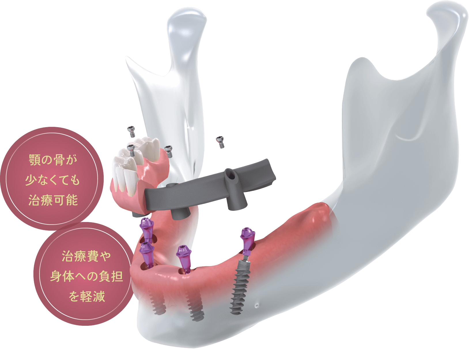 オールオン4は4本のインプラントでバランスよく支える治療法のため、顎の骨が足りない部分があっても問題ございません。
