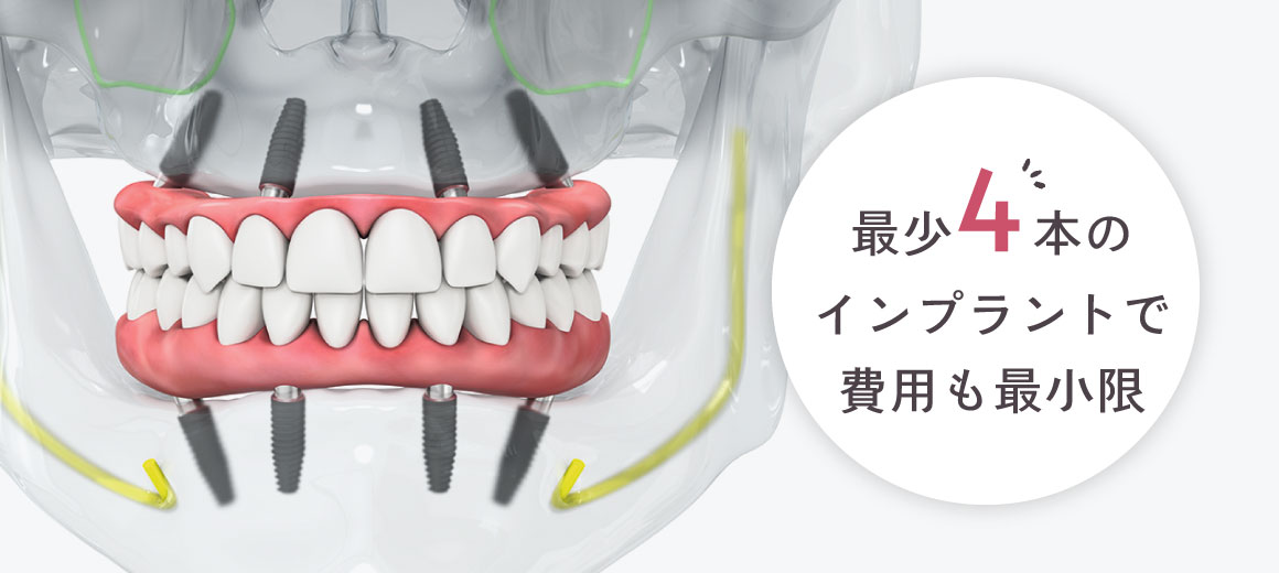 All-on-4®(オールオン4)とは、4~6本のインプラントを埋入した上に固定式の12本連結の歯を装着させる治療法です。骨造成や移植を必要とせずに、最小限のインプラントで全ての歯を安定させます。歯の抜歯からインプラントの埋め込み、仮歯の装着まですべてを1日で行うことが可能なため、外科手術による身体的負担、治療回数、費用負担を軽減することができます。